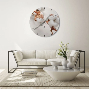 - Eine runde Glasuhr 30x30 cm mit einer künstlerischen Darstellung von weißen, flauschigen Baumwollblumen auf hellem Hintergrund, perfekt für minimalistische und skandinavische Inneneinrichtungen.
