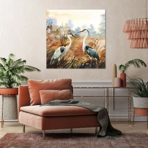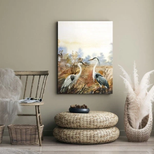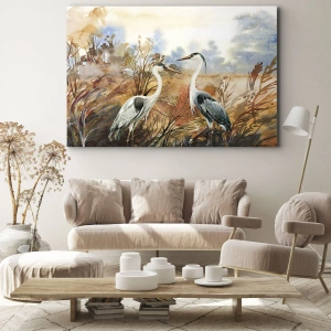 Bild auf Leinwand - Leinwandbild - Zwei Reiher vor dem Hintergrund einer herbstlichen Landschaft - 50x70cm - Wohin im Herbst? - Moderne Wanddekoration für Wohnzimmer und Schlafzimmer ARTTOR