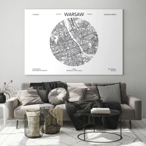 - Eine stilvolle Grafik mit einer detaillierten Schwarz-Weiß-Karte von Warschau. Sie fügt sich perfekt in moderne Innenräume ein und verleiht ihnen Klasse und Charakter. Das Grafikdesign unterstreicht die urbane Atmosphäre und den einzigartigen Charakter...