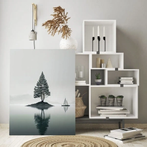 Wandgemälde – Traum – Einsamer Baum auf einer kleinen Insel und ein Segelboot auf einem ruhigen See
