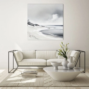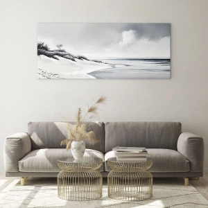 • Das Gemälde zeigt eine ruhige Küstenlandschaft in Schwarzweiß. Die minimalistische Form und die gedämpften Farben schaffen eine stimmungsvolle Atmosphäre und ein Gefühl der Ruhe.