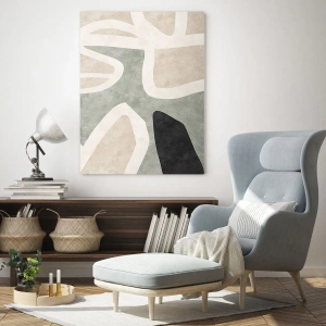 • Das Gemälde zeigt abstrakte Figuren und Formen in Beige- und Grüntönen mit einem deutlichen Akzent in Schwarz. Die minimalistische Form und die natürliche Farbpalette schaffen eine moderne, ausgewogene Komposition.
