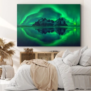 Bild auf Leinwand - Leinwandbild - Berge, umgeben von Polarlichtern, die sich im Wasser spiegeln - 70x50cm - In den Armen der Aurora - Moderne Wanddekoration für Wohnzimmer und Schlafzimmer ARTTOR