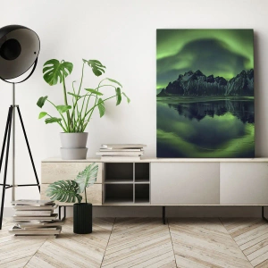 - Ein Gemälde, das Berge zeigt, umgeben von den magischen Nordlichtern, die sich im Wasser spiegeln. Ein ideales Dekorationselement, um die Harmonie und Schönheit der Natur in Innenräume zu bringen.