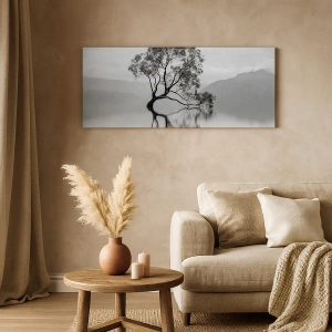 - Dieser 70x50 cm große Leinwanddruck zeigt einen einsamen Baum, der sich im Wasser spiegelt, vor einer schwarz-weißen Bergkulisse. Eine einzigartige Dekoration, die jedem Interieur Ruhe und Harmonie verleiht.