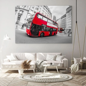 Glasbild - Bild auf glas - Ein roter Bus in Bewegung vor der Kulisse der Londoner Straßen - 120x80cm - London traditionell - mit dem Bus - Moderne Wanddekoration für Wohnzimmer und Schlafzimmer ARTTOR