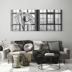 Glasbild - Bild auf glas - Ballerina mit Engelsflügeln in Schwarz und Weiß - 70x50cm - Stadt der Engel? - Moderne Wanddekoration für Wohnzimmer und Schlafzimmer ARTTOR
