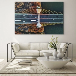 Glasbild - Bild auf glas - Luftaufnahme der Brücke mit symmetrischer Anordnung von Kabeln und Wagen - 70x50cm - Jenseits der Gewässer, jenseits der Wälder - Moderne Wanddekoration für Wohnzimmer und Schlafzimmer ARTTOR