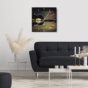 - Eine Wanduhr mit einer magischen Nachtlandschaft. Sterne, ein See und der Mond bilden ein geheimnisvolles Motiv, das dem Interieur eine Atmosphäre der Ruhe und Harmonie verleiht.