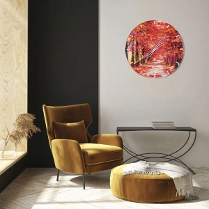 - Diese runde Wanduhr im Format 30 x 30 cm zeigt ein malerisches herbstliches Wegmotiv in leuchtenden Rottönen. Perfekt für stilvolle und künstlerische Innenräume.