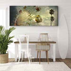Die Vintage-Atmosphäre wird durch Pastellfarben und subtile Details betont, die dem Werk einen einzigartigen Charakter verleihen. Das Riesenrad, ein Symbol für Unterhaltung und unvergessliche Momente, steht im Mittelpunkt der Komposition und die umliegenden Palmen verleihen einen exotischen Touch. Dieser 70 x 50 cm große Leinwanddruck eignet sich perfekt zur Dekoration eines Wohnzimmers, Schlafzimmers oder sogar eines Cafés oder Geschäftsraums.
