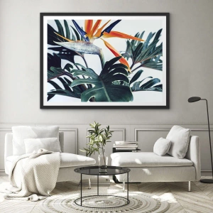 Poster in einem schwarzem Rahmen - Strelitzia-Blüte, umgeben von Blättern in hellem Licht - 70x50cm - Vogelbusch - Moderne Wanddekoration für Wohnzimmer und Schlafzimmer ARTTOR