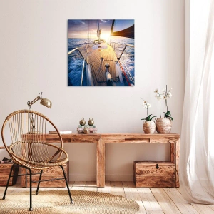 Wandkunstdruck – Laufen auf den Wellen – Yacht auf See bei Sonnenuntergang