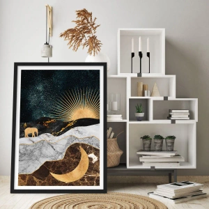 - Dieses Poster zeigt eine goldene Landschaft mit Mond, Sonne und der Silhouette eines Elefanten. Die Kombination aus Marmorstrukturen und kosmischer Szenerie schafft eine einzigartige Komposition voller Eleganz und Harmonie.