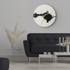Wanduhr „Vibrations of Imagination“ ist Ausdruck einer minimalistischen Ästhetik, inspiriert von zeitgenössischer abstrakter Kunst. Das Hauptelement der Komposition ist ein intensiver, schwarzer Pinselstrich, der sich über die Mitte des Zifferblatts erstreckt und einen Kontrast zum hellen, neutralen Hintergrund bildet. Das einfache, aber entschiedene Muster zieht den Blick auf sich und erzeugt visuellen Rhythmus und Dynamik.