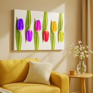 Bild auf Leinwand - Leinwandbild - Bunte Tulpen in einer Reihe auf weißem Hintergrund angeordnet - 120x50cm - Regenbogenkomposition - Moderne Wanddekoration für Wohnzimmer und Schlafzimmer ARTTOR