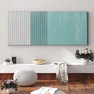 Der Leinwanddruck "Ausgewogene Komposition" ist Ausdruck moderner Ästhetik und besticht durch Schlichtheit und Raffinesse. Er zeigt eine geometrische Komposition, bei der türkisfarbene Akzente harmonisch mit linearen Mustern interagieren und so ein minimalistisches Design schaffen. Subtile Übergänge und Strukturen verleihen dem Werk Tiefe und Eleganz.
