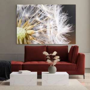 - Das Gemälde zeigt eine Nahaufnahme eines zarten Löwenzahns mit schwimmenden Samen. Die minimalistische Komposition bringt Harmonie und Ruhe, perfekt für Innenräume im natürlichen Stil.