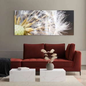 Eine Nahaufnahme einer Pusteblume mit zarten, in der Luft schwebenden Samen schafft eine minimalistische Komposition, die Ruhe und Harmonie in den Innenraum bringt. Das 70 x 50 cm große Glasgemälde besticht durch seine Eleganz und Langlebigkeit.