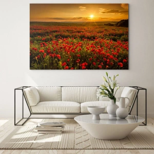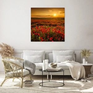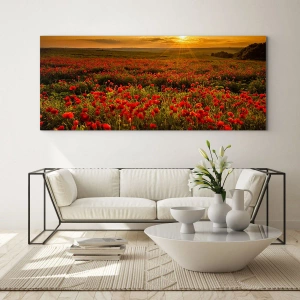 Glasbild - Bild auf glas - Ein Feld mit roten Mohnblumen im Schein der untergehenden Sonne - 70x100cm - Unter den Wellen raschelnder Wiesen, unter den Blumen der Flut - Moderne Wanddekoration für Wohnzimmer und Schlafzimmer ARTTOR