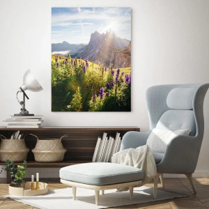 Glasbild - Bild auf glas - Eine Bergwiese voller Blumen vor der Kulisse felsiger Gipfel bei Sonnenaufgang - 50x70cm - Das geheime Leben der Kräuter - Moderne Wanddekoration für Wohnzimmer und Schlafzimmer ARTTOR