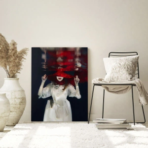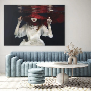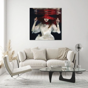 Glasbild - Bild auf glas - Frau mit rotem Hut unter Wasser - 50x70cm - Boshafte Göttin in der slawischen Mythologie - Moderne Wanddekoration für Wohnzimmer und Schlafzimmer ARTTOR