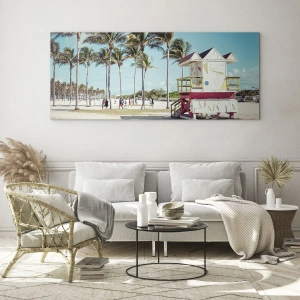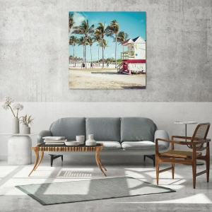 Glasbild - Bild auf glas - Ein Strand mit Palmen und einem Rettungsschwimmerturm an einem sonnigen Tag - 50x70cm - Dir steht ein schöner Tag bevor - Moderne Wanddekoration für Wohnzimmer und Schlafzimmer ARTTOR