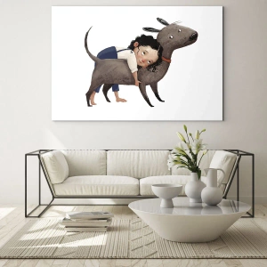 • Diese bezaubernde Illustration eines Mädchens, das einen großen Hund kuschelt, strahlt Wärme, Liebe und kindliche Freude aus. Das schlichte Design und der helle Hintergrund eignen sich perfekt für ein Kinderzimmer oder einen Familienraum.