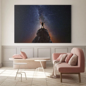 Die Figur vor dem Nachthimmel symbolisiert Mut, Freiheit und den Wunsch, das Unbekannte zu entdecken. Die Komposition ist perfekt ausbalanciert – die dunklen Töne des Himmels stehen im Kontrast zum subtilen Licht, das von den Sternen gestreut wird. Im Hintergrund ist außerdem die helle Spur eines vorbeiziehenden Sterns sichtbar, die für Dynamik sorgt und die emotionale Wirkung des Bildes noch verstärkt.