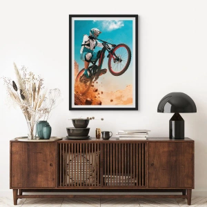 - Ein Poster, das einen Mountainbiker bei einem dynamischen Sprung vor einer Wüstenlandschaft zeigt und die Atmosphäre von Abenteuer, Adrenalin und Wettkampfleben perfekt einfängt.
