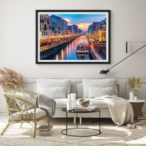 Poster in einem schwarzem Rahmen - Kanal mit Boot und Abendbeleuchtung in einem pastellfarbenen Sonnenuntergang - 50x70cm - Ein Abend voller Licht und Spaß - Moderne Wanddekoration für Wohnzimmer und Schlafzimmer ARTTOR