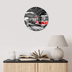 Wanduhr - Glasuhr - Roter Zug am Bahnhof unter einem Dach - 30x30cm - Vielleicht ist es eine Reise Ihres Lebens? - Moderne Wanddekoration für Wohnzimmer und Schlafzimmer ARTTOR