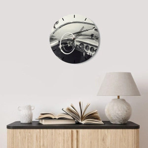 - Diese runde Wanduhr zeigt das Interieurdesign eines klassischen Autos mit Lenkrad und elegantem Armaturenbrett. Eine stilvolle Ergänzung für Interieurs im Automobil- und Retro-Stil.