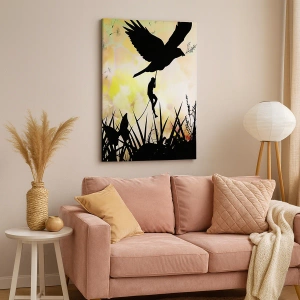 Bild auf Leinwand - Leinwandbild - Natursilhouette mit einem Vogel und einem Löwenzahn - 50x70cm - In märchenhafter Atmosphäre - Moderne Wanddekoration für Wohnzimmer und Schlafzimmer ARTTOR