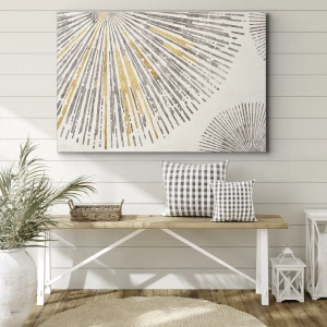 Das Leinwandbild „Die Schönheit des Strahls“ ist eine künstlerische Komposition, die ein abstraktes strahlenförmiges Muster in Gold- und Beigetönen darstellt. Sein subtiles Design und seine harmonische Komposition verleihen Innenräumen eine einzigartige Eleganz und Ruhe.