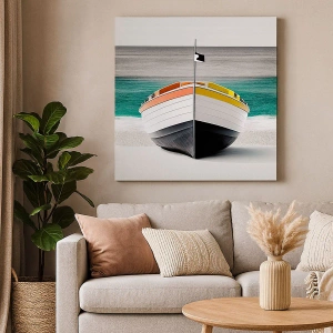- Dieses Gemälde zeigt ein Boot an einem ruhigen Strand mit türkisfarbenem Meer im Hintergrund. Eine perfekte Dekoration, die jedem Interieur Harmonie und Ausdruckskraft verleiht.