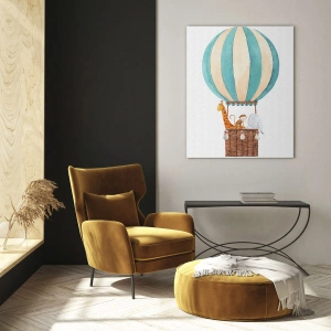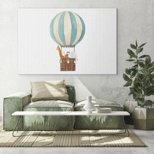 Glasbild "Fantastische Reise" ist eine märchenhafte Illustration, die die Fantasie von Kindern anregt und eine Atmosphäre unbeschwerter Abenteuer ins Interieur bringt. Auf einem weißen Hintergrund ist ein Ballon in Mint- und Beigetönen zu sehen, der mit einem Korb in der Luft schwebt, in dem entzückende Tiere reisen - eine Giraffe, ein Affe und ein Elefant.