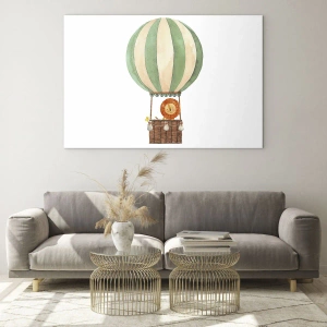Glasbild - Bild auf glas - Ein Löwe in einem Ballonkorb schwebt auf weißem Hintergrund - 50x70cm - Leons Reisen - Moderne Wanddekoration für Wohnzimmer und Schlafzimmer ARTTOR