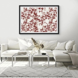 Die floralen Details werden abstrakt dargestellt, wodurch ein Effekt von Textur und Tiefe entsteht. Rote Akzente ziehen den Blick auf sich, beleben die Komposition und verleihen ihr Ausdruckskraft. Dieses Poster eignet sich perfekt für Räume, die dezente und dennoch stilvolle Dekorationen erfordern.