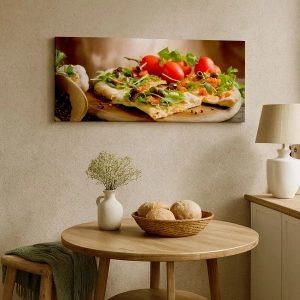 Das Leinwandbild "Direkt aus dem Ofen und aus dem Garten" ist ein einzigartiges Angebot für Liebhaber kulinarischer Motive in der Inneneinrichtung. Es zeigt eine frisch zubereitete Pizza mit knusprigem Teig, großzügig dekoriert mit Gemüse, Rucola und Oliven. Die Komposition wird auf einem Holzbrett serviert, was ihren rustikalen und natürlichen Charakter unterstreicht. Saftige Tomaten im Hintergrund sorgen für Farbe und ein appetitliches Aussehen.