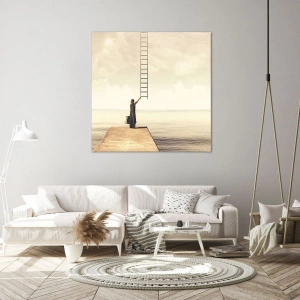 - Dieser Leinwanddruck zeigt eine Frau, die auf einem Pier steht, an dem eine Leiter in den Himmel führt. Perfekt für Innenräume, in denen Kunst und Symbolik im Vordergrund stehen.
