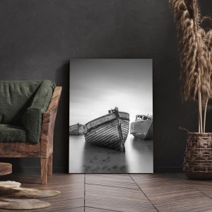 - Das Gemälde zeigt verlassene Boote, die in Schwarz-Weiß-Optik auf einer ruhigen Wasseroberfläche liegen. Eine subtile Landschaft voller Nostalgie und Reflexion, perfekt für minimalistische oder klassische Innenräume.