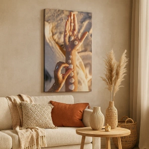 • Ein subtiles Gemälde, das Hände zeigt, die Muscheln vor einem sandigen Hintergrund halten. Sein minimalistischer Stil bringt Harmonie und Inspiration in jedes Interieur. Eine perfekte Wahl für ein Schlafzimmer oder Wohnzimmer.