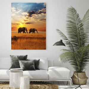 - Dieses Gemälde zeigt zwei Elefanten, die bei Sonnenuntergang die Savanne durchqueren. Seine warmen Farben und die exotische Atmosphäre schaffen die perfekte Kulisse für Liebhaber der Tierwelt und afrikanischer Landschaften.