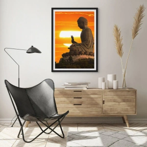 Poster in einem schwarzem Rahmen - Eine buddhistische Statue vor dem Hintergrund eines orangefarbenen Sonnenuntergangs - 70x50cm - Keine Angst vor der Welt - Moderne Wanddekoration für Wohnzimmer und Schlafzimmer ARTTOR
