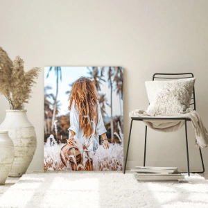 - Diese Szene zeigt eine Frau, die mit einem Hut in der Hand im hohen Gras steht und von Palmen umgeben ist. Die Atmosphäre des Bildes ist romantisch, entspannt und warm. Es passt perfekt zu Boho- und naturinspirierten Innenräumen.