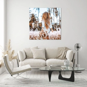 Glasbild - Bild auf glas - Eine Frau im Gras mit einem Hut in der Hand vor einem Hintergrund aus Palmen - 70x50cm - Geboren aus Grasflaum - Moderne Wanddekoration für Wohnzimmer und Schlafzimmer ARTTOR