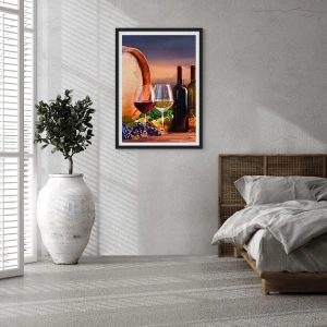 Poster in einem schwarzem Rahmen - Wein, Gläser und ein Fass in einer malerischen Landschaft - 70x50cm - Hier schmeckt das Leben - Moderne Wanddekoration für Wohnzimmer und Schlafzimmer ARTTOR