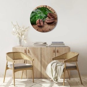 "{title_coffee_leaf}" ist eine stilvolle Wanduhr, die die Schönheit der Natur mit der Ästhetik eines rustikalen Stils verbindet. Das Motiv zeigt Kaffeebohnen, begleitet von einem grünen Blatt, arrangiert vor einer Holzoberfläche. Diese harmonische Komposition unterstreicht die natürliche Schönheit und aromatische Symbolik des Kaffees und ist die perfekte Ergänzung für Küche, Café oder andere gemütliche Innenräume.
