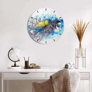 - Eine Wanduhr mit einem Taucher und bunten Fischen in einer künstlerischen Unterwasserwelt. Die perfekte Ergänzung für jedes Interieur, die einen exotischen und entspannenden Touch verleiht.